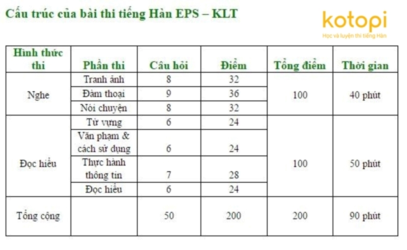 Kỳ thi EPS TOPIK gồm 2 phần chính: phần nghe và phần đọc hiểu. Tổng thời gian làm bài là 2 giờ 30 phút. Điểm số tối đa cho mỗi phần là 100 điểm, với tổng điểm là 200. Để đạt yêu cầu, thí sinh cần đạt ít nhất 120 điểm trong tổng điểm 200.